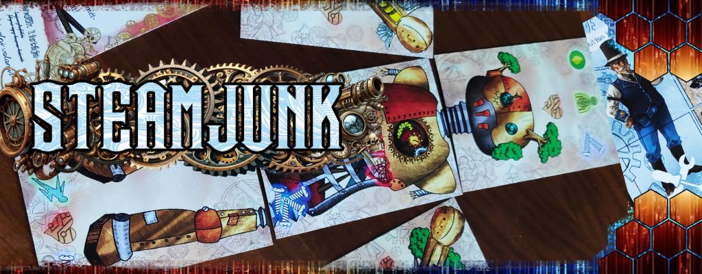 Dobópakli mechanika… A dobópaklit a játékok többsége egy gyűjtőhelyként kezeli, amit újrakeverünk, ha elfogy a húzópakli; szerencsésebb esetben kikukázhatunk belőle korábban eldobott kártyákat. Miért ne adnánk egy új színteret a szemétnek szánt kártyának? Ebből a gondolatból született a SteamJunk.